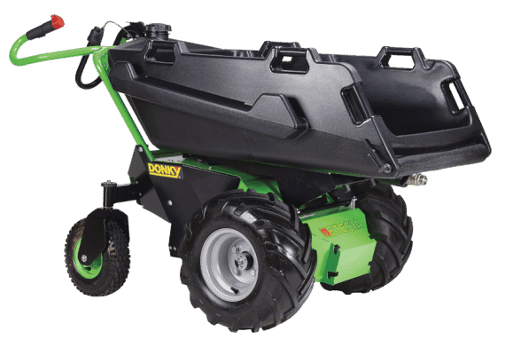 La brouette électrique Donky soulage le travail sur les chantiers. Finies les lourdes charges à déplacer péniblement par la seule force de ses bras. oubliés le vacarme, les fumées polluantes et le coût du carburant de la brouette thermique.