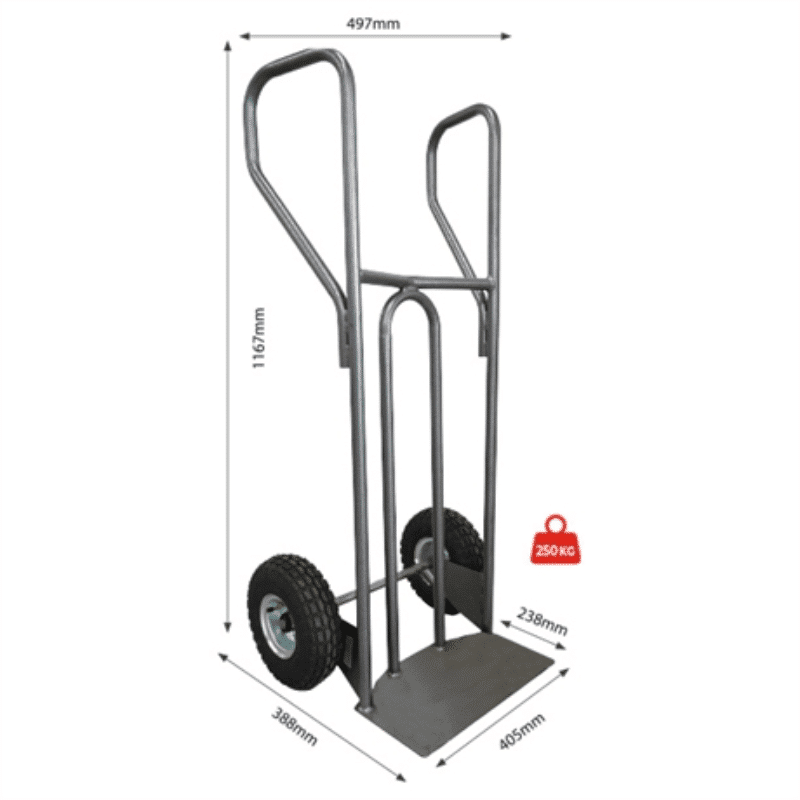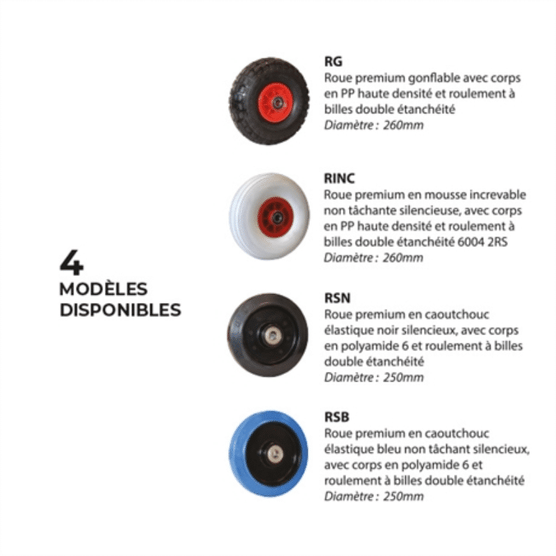 - Capacité : 250 kg - Hauteur hors tout : 1167 mm - Longueur hors tout : 497 mm - Profondeur hors tout : 388 mm - Dimensions bavette : 405 x 238 mm - Type bavette : Fixe - Type de bandage des roues : Gonflables, Caoutchouc élastique bleu, Caoutchouc élastique noir, Mousse increvable (selon le modèle choisi) - Type de corps des roues : PP haute densité ou Polyamide 6 (selon le modèle choisi) - Type de roulements : À billes double étanchéité - Diamètre Roues : 260 mm - Poids : 8 kg
