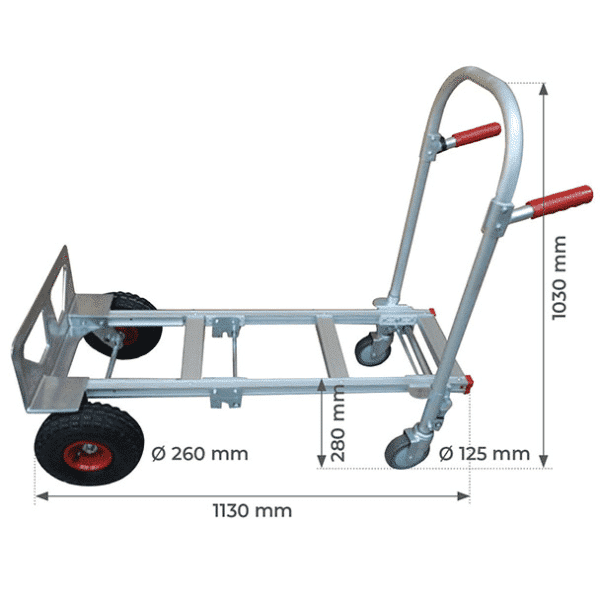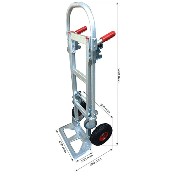 - Capacité de charge : 200 kg (diable) et 350 kg (chariot) - Chaque pièce est interchangeable facilement - Poids : 17.5 kg - Roues gonflables ø 260 mm sur jantes plastiques haute densité, montées sur roulement double étanchéité - Roues de grand diamètre pour un meilleur franchissement et une meilleure maniabilité