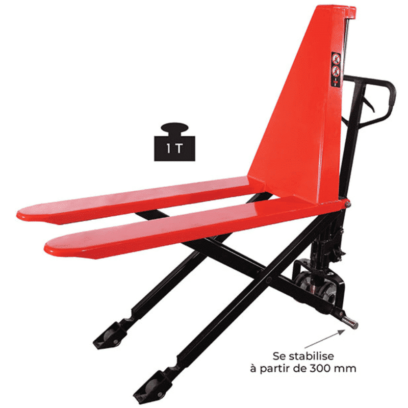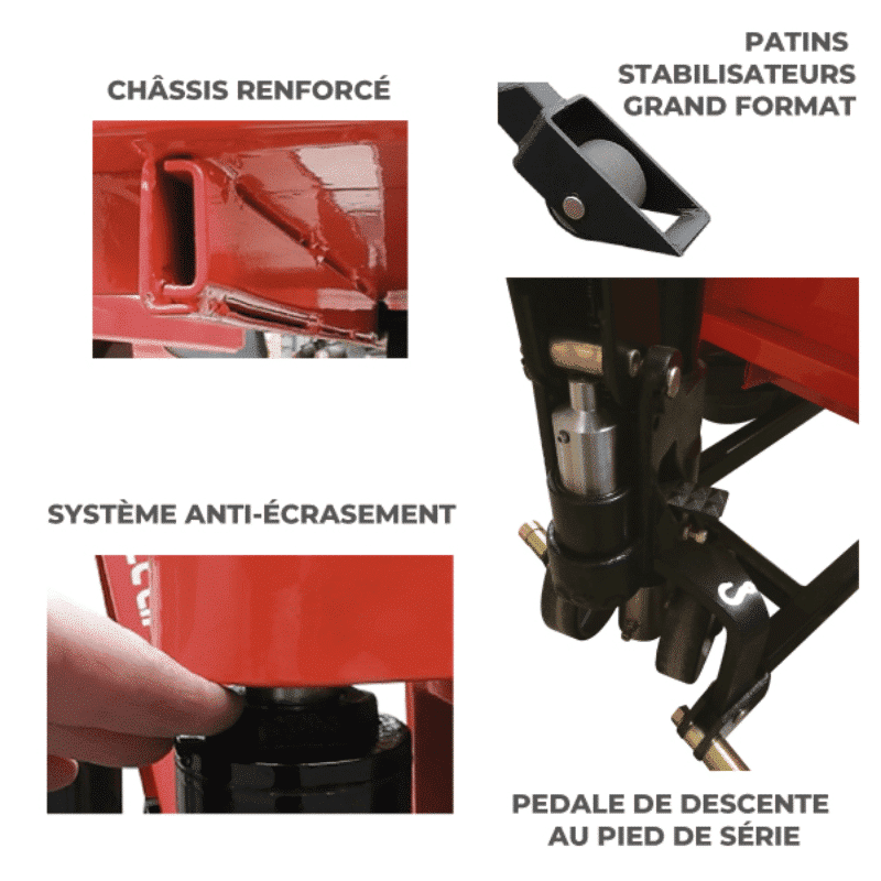 - Il est équipé de deux stabilisateurs latéraux qui le bloquent au-delà de 400 mm d’élévation et apportent ainsi une excellente stabilité